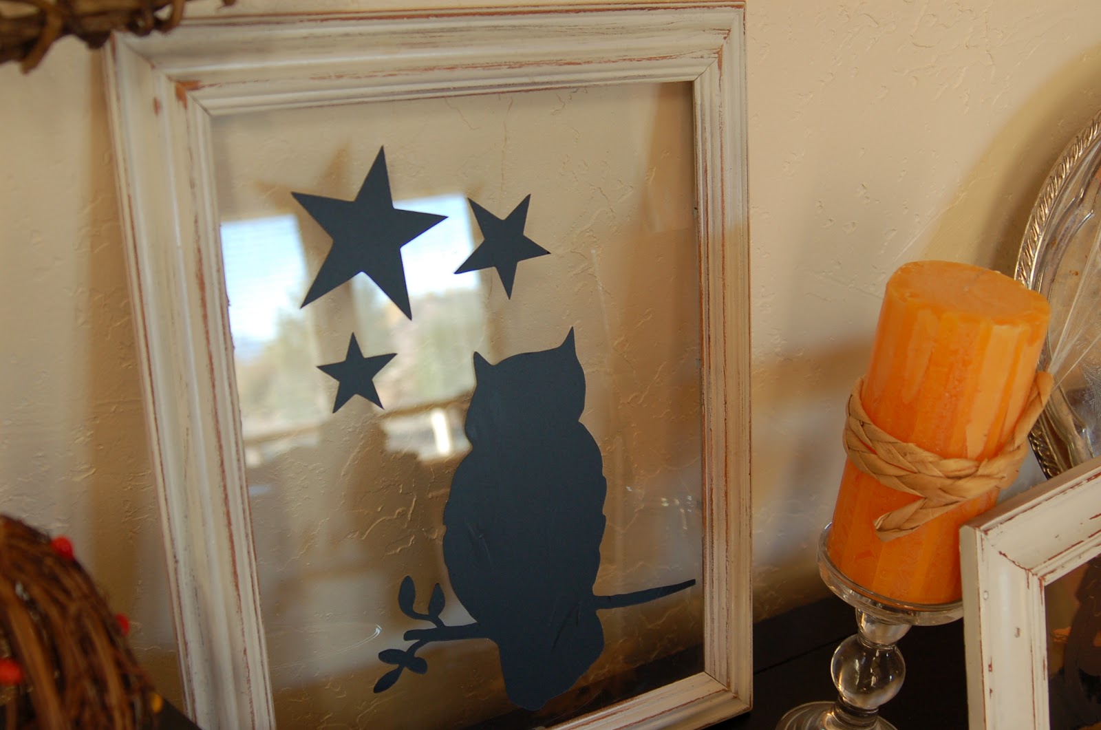 My favorite Halloween Decorations are the white picture frames! I made these a few years ago with Cassidy. We went to our D.I. and picked up some cheap picture frames. We painted them and then roughed them up a little. Cassidy cut out some fun Halloween images on her cricuit and then we applied them to the glass. In order to keep the glass in the frame without the back on the frames we had to hot glue gun the glass to the frames! These turned out so cute and I am happy with the way they look!